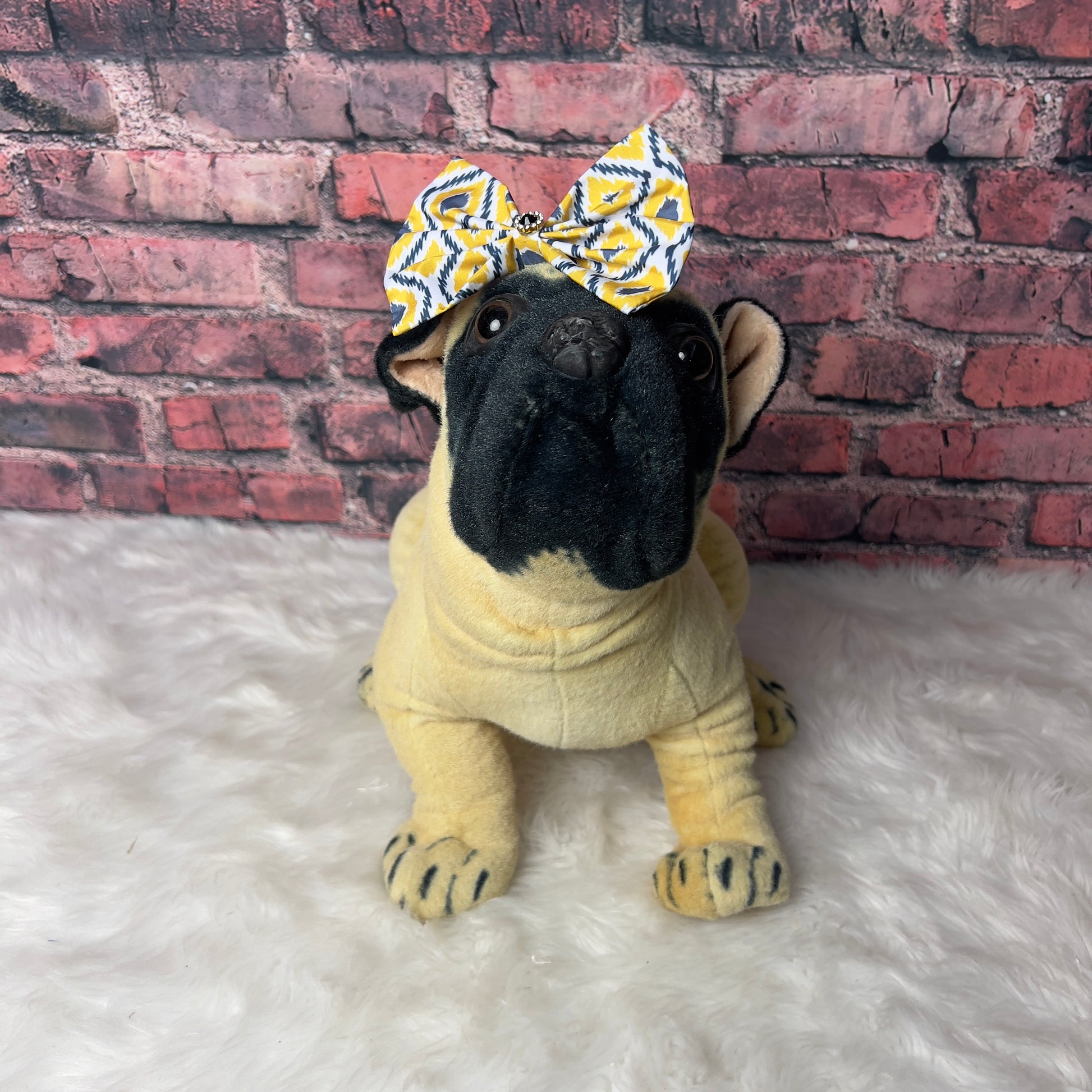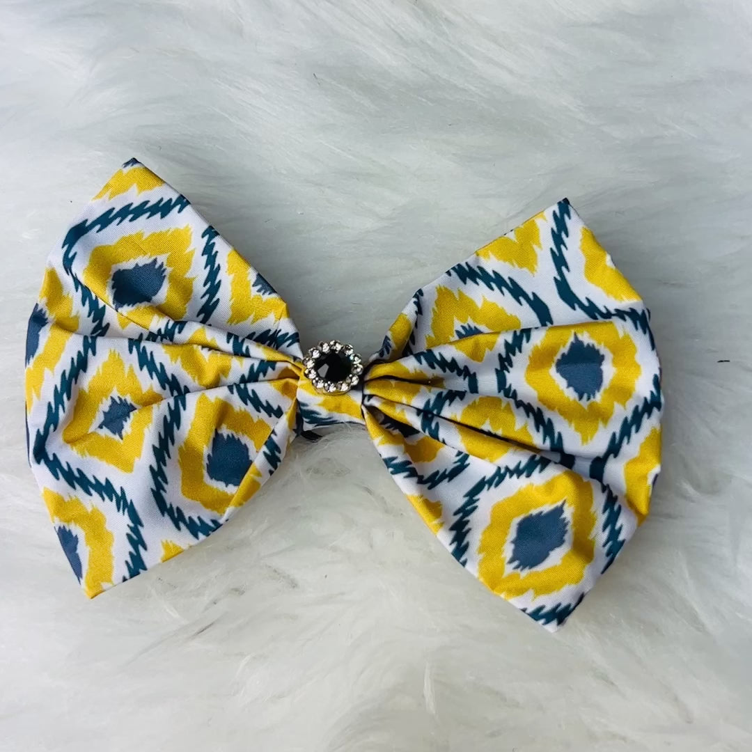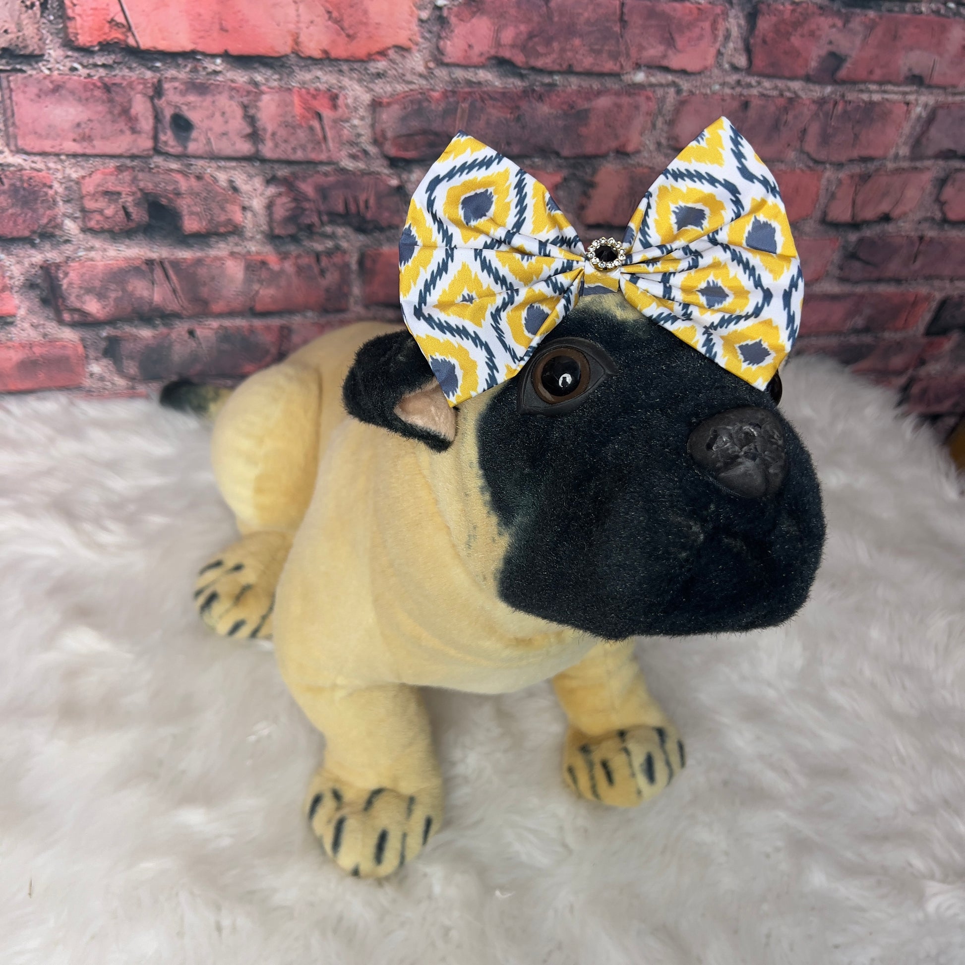 This 6 pack of black and gold oversized bows features exquisite rhinestone accents and a secure rubber band on the back for effortless styling. With its lightweight design, these bows are perfect for adding a touch of glamour and sophistication to any hairdo. Don't miss out on this must-have accessory for any fashion-forward pup.