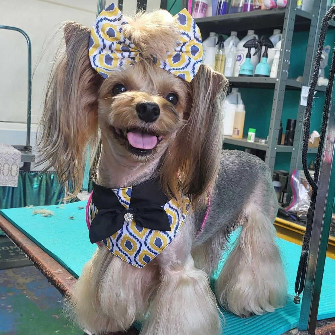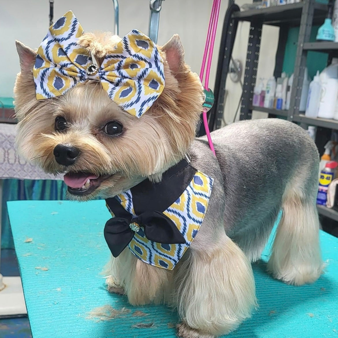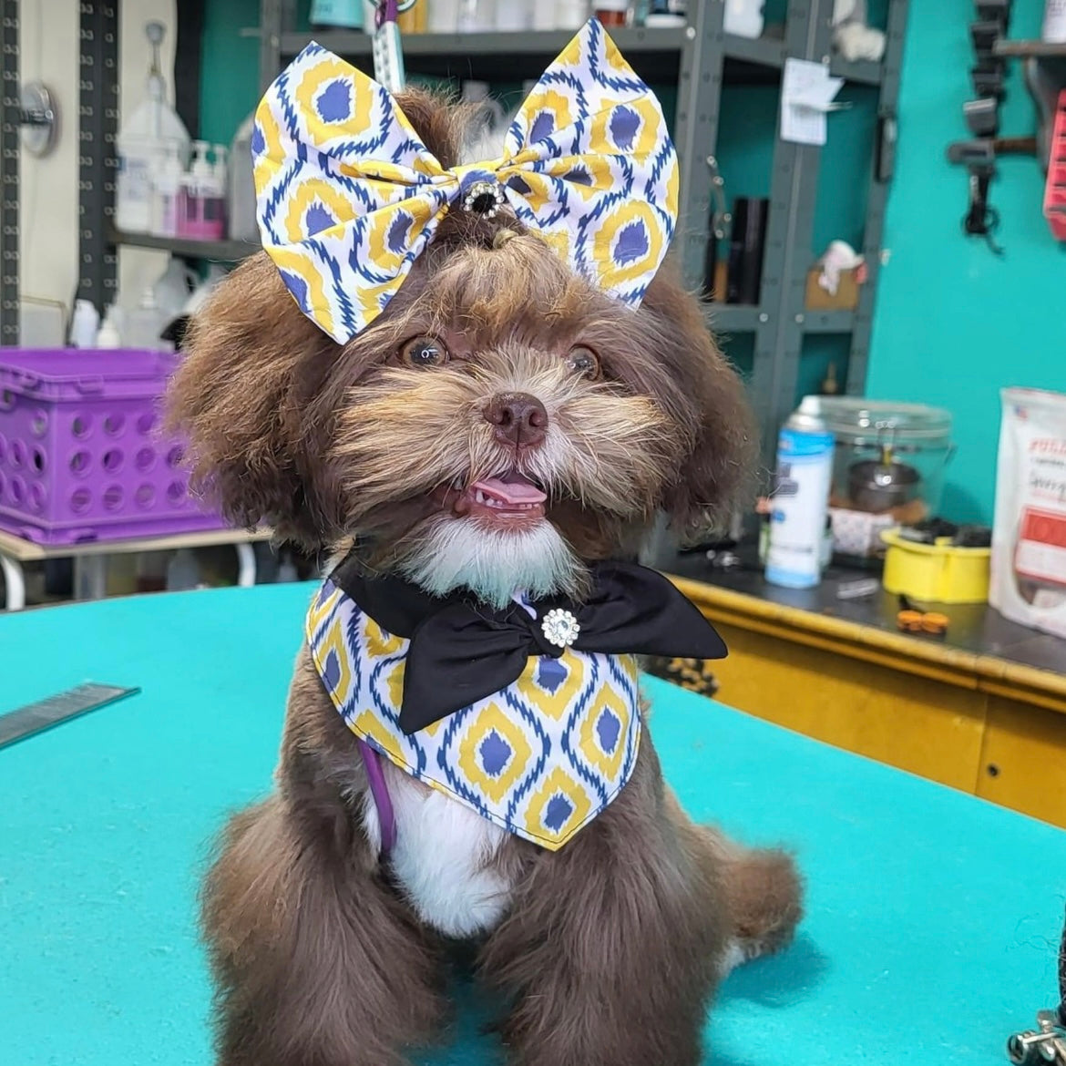 This 6 pack of black and gold oversized bows features exquisite rhinestone accents and a secure rubber band on the back for effortless styling. With its lightweight design, these bows are perfect for adding a touch of glamour and sophistication to any hairdo. Don't miss out on this must-have accessory for any fashion-forward pup.