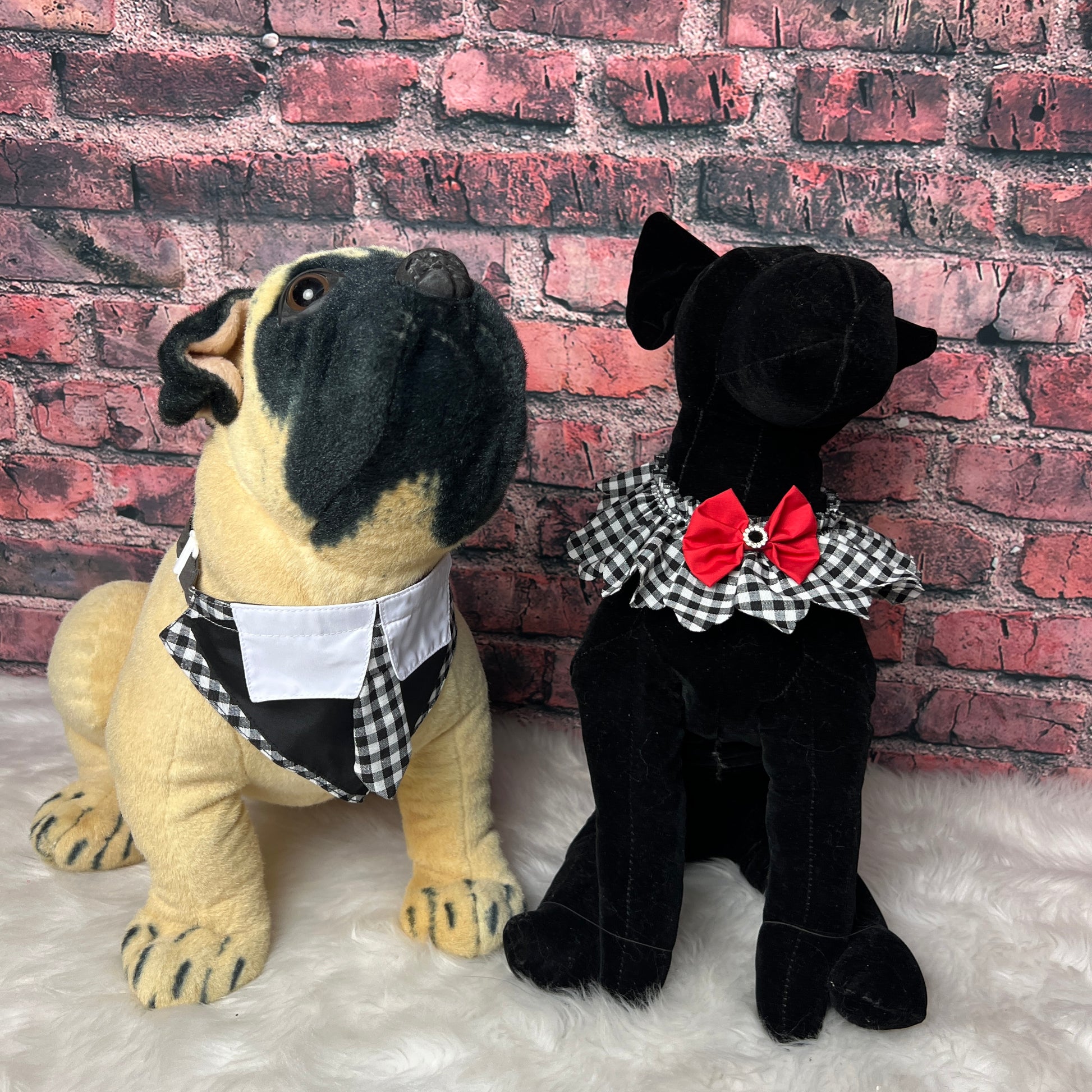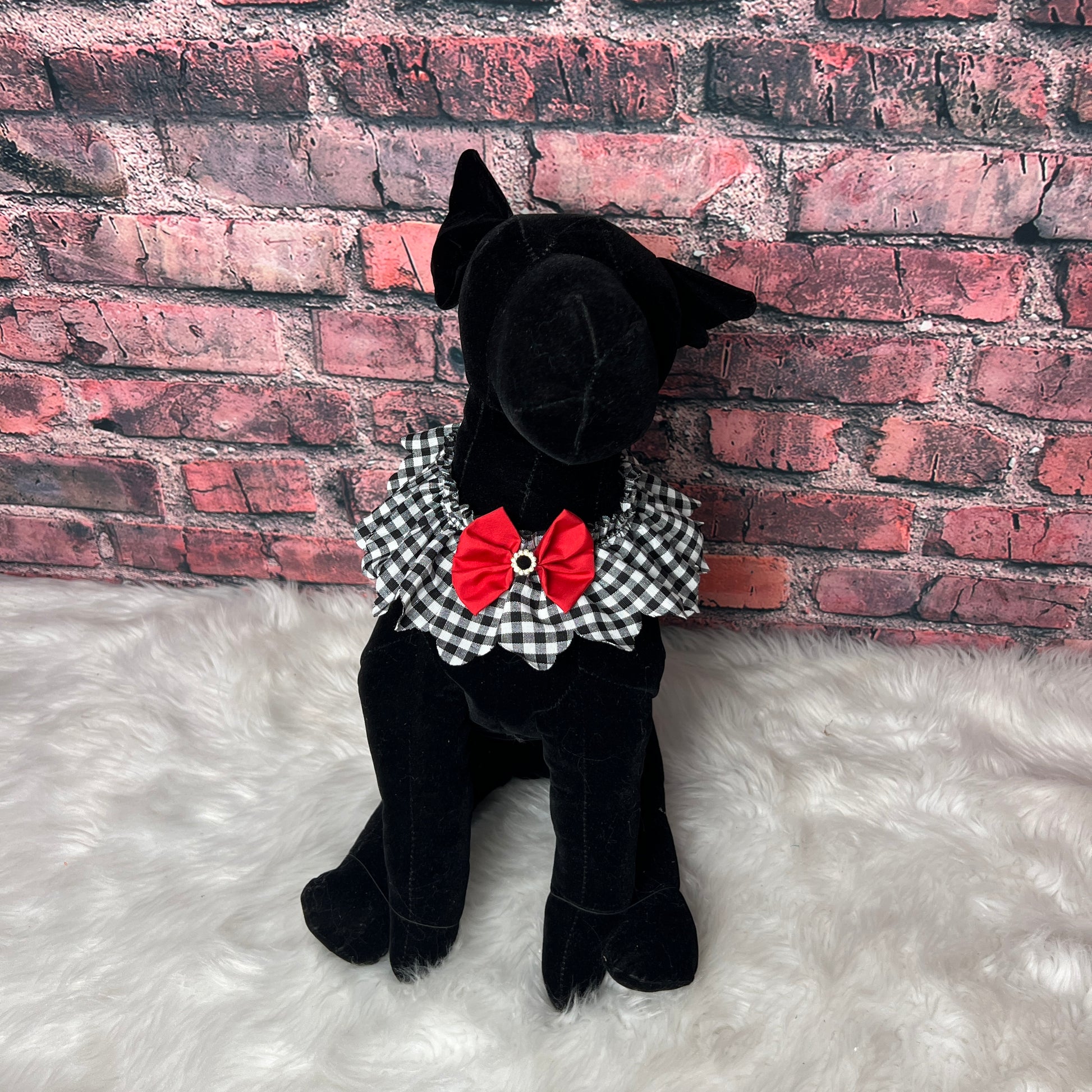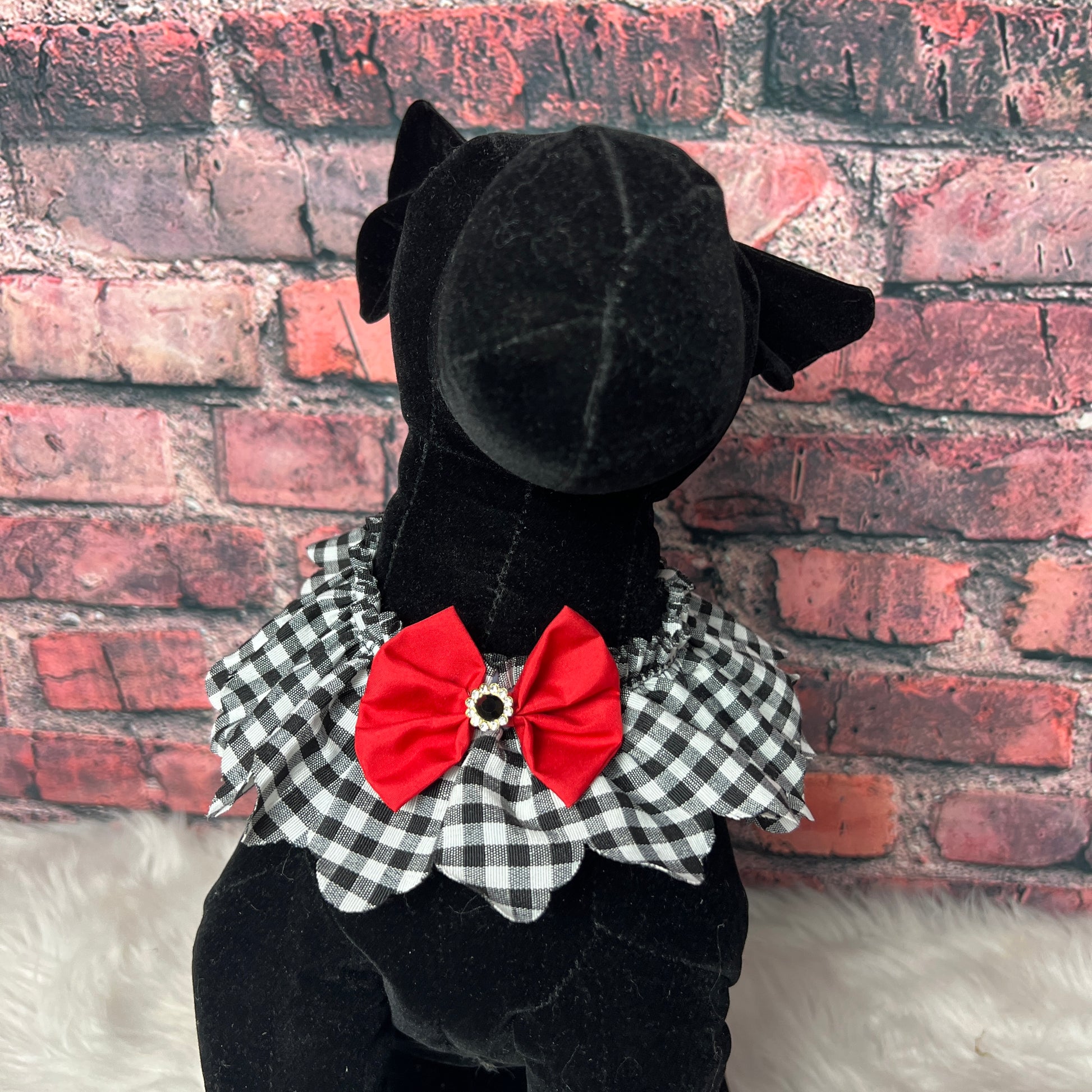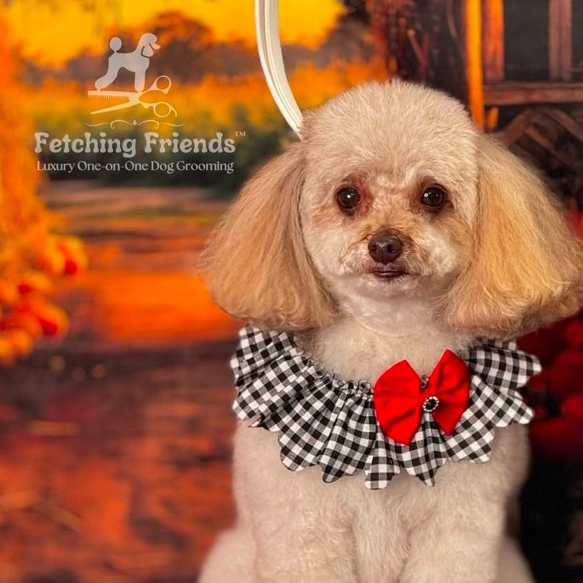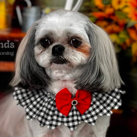 This BLACK & WHITE CHECK FULL RUFFLE is a must-have accessory for any dog grooming salon. Made with high-quality materials, it adds a touch of elegance and style to any dog's grooming session. Keep your furry clients looking their best with this sophisticated and functional ruffle.
