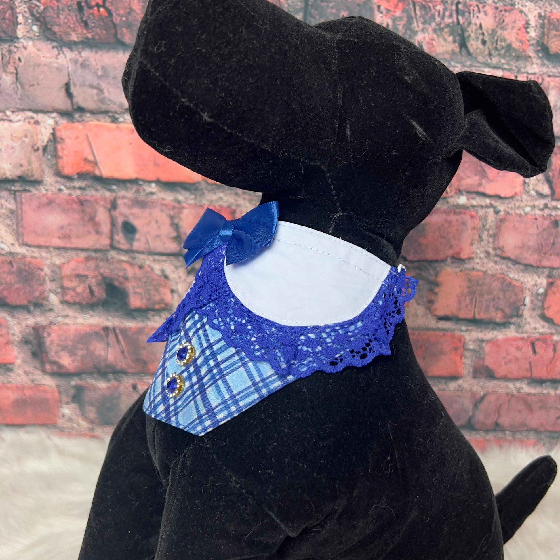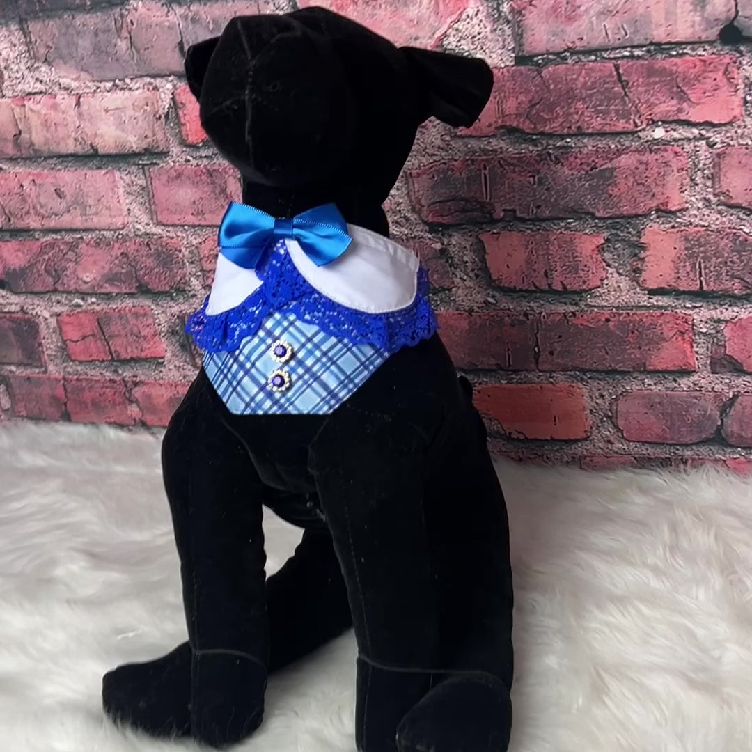 Elevate your grooming game with our Blue Plaid Boy Bib! Keep your furry client looking fresh after grooming sessions with this ADORABLE bib, featuring an adjustable strap with a convenient clasp in the back. A must-have dog accessory for any grooming salon! FITS NECK SIZES 10”-13”.