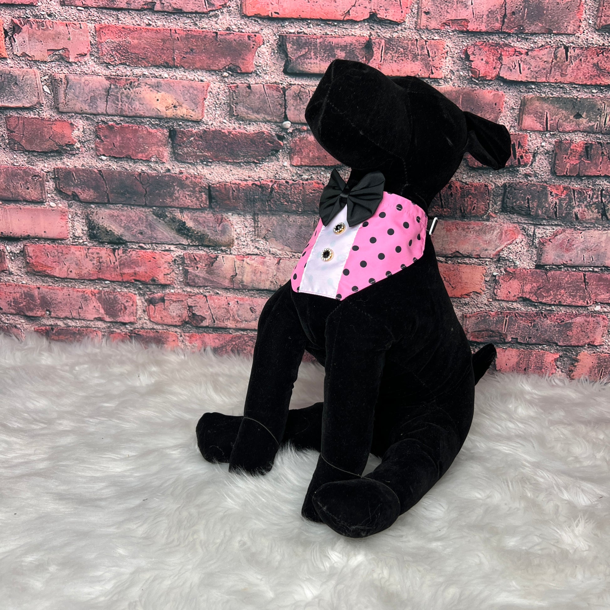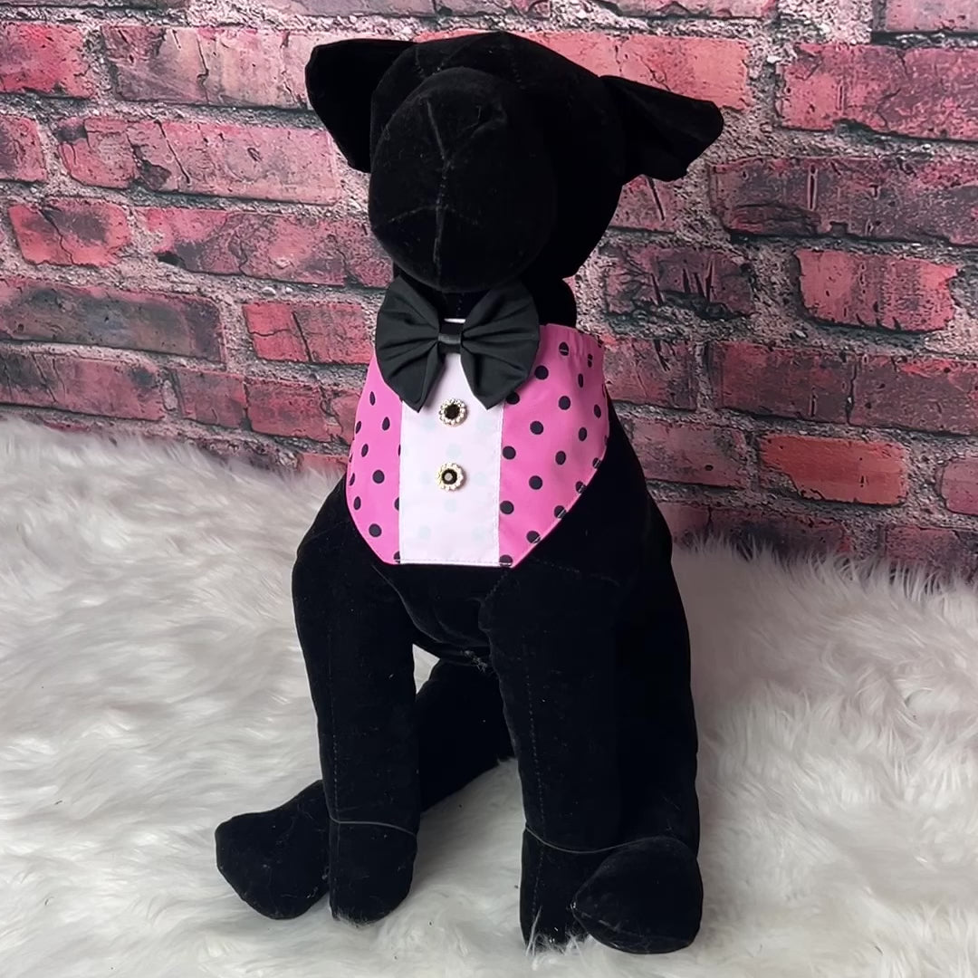 The perfect stylish accessory for your furry client, PINK W/ BLACK DOTS BOY BIB. Designed for small to medium sized dogs, these bibs feature an adjustable band and snap in the back for a secure fit. Perfect for dog groomers and grooming salons, add a touch of fun to your grooming experience. FITS NECK SIZES 11-13 INCHES.