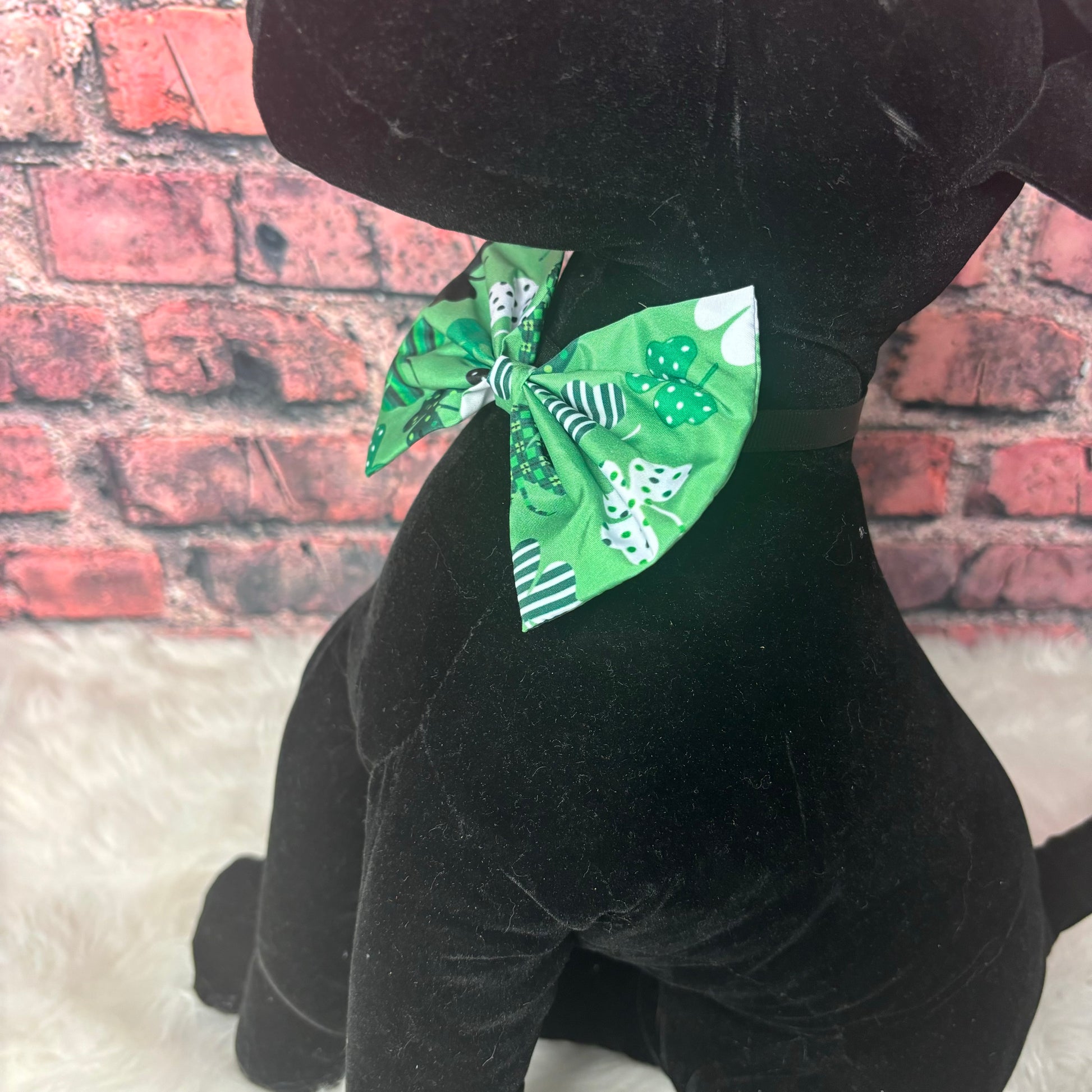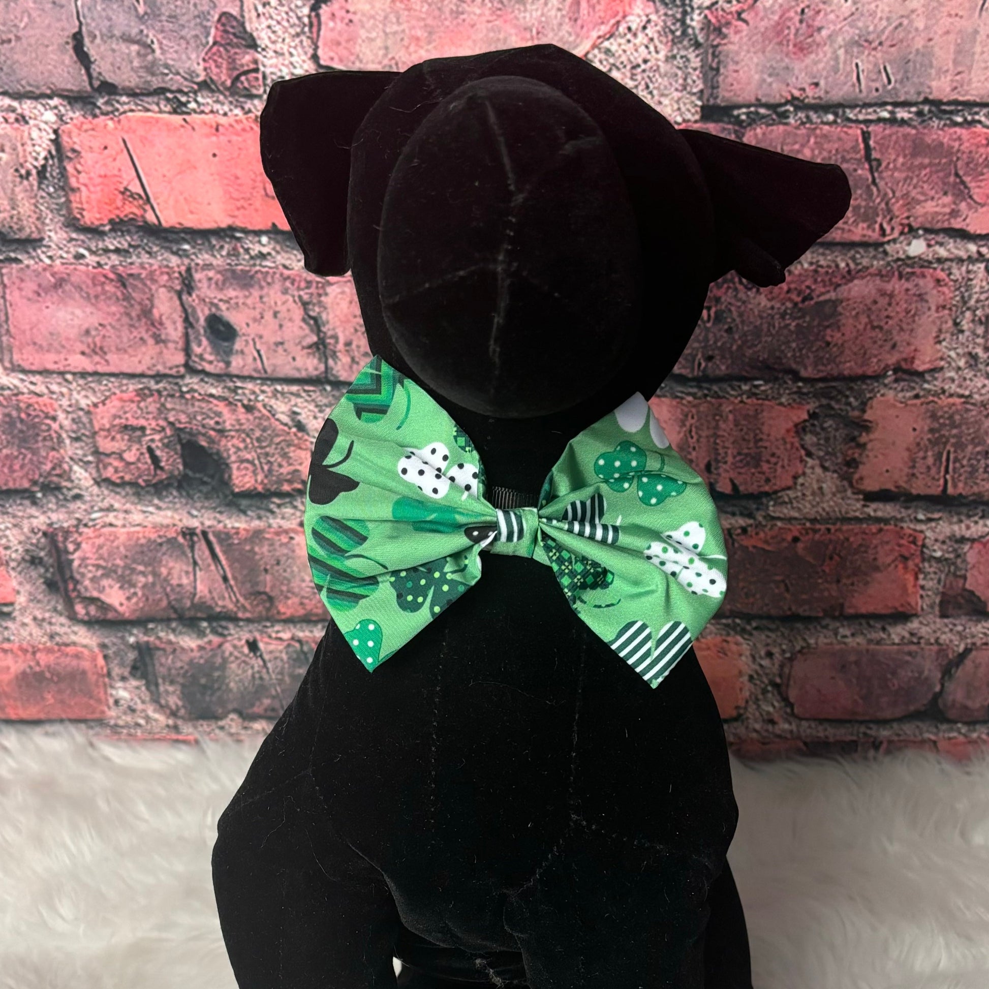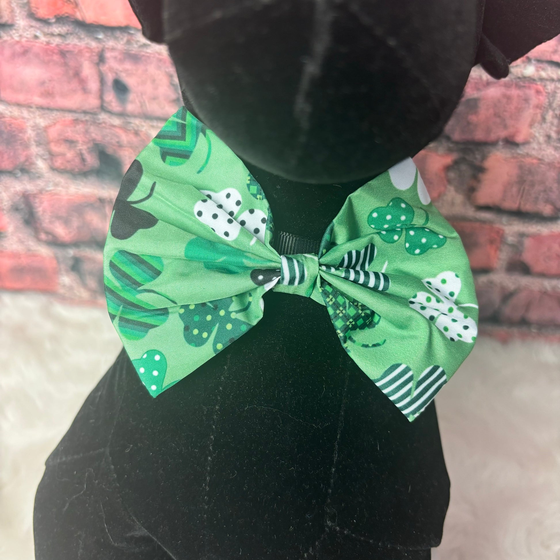Elevate your dog grooming game with our Lucky Dog Collar Bowtie! These green fabric bowties with shamrock accents are perfect for groomers looking to add a touch of luck to their clients' collars. Elastic bands make it easy to attach to your collar or band. BOW IS 4.5” IN WIDTH.