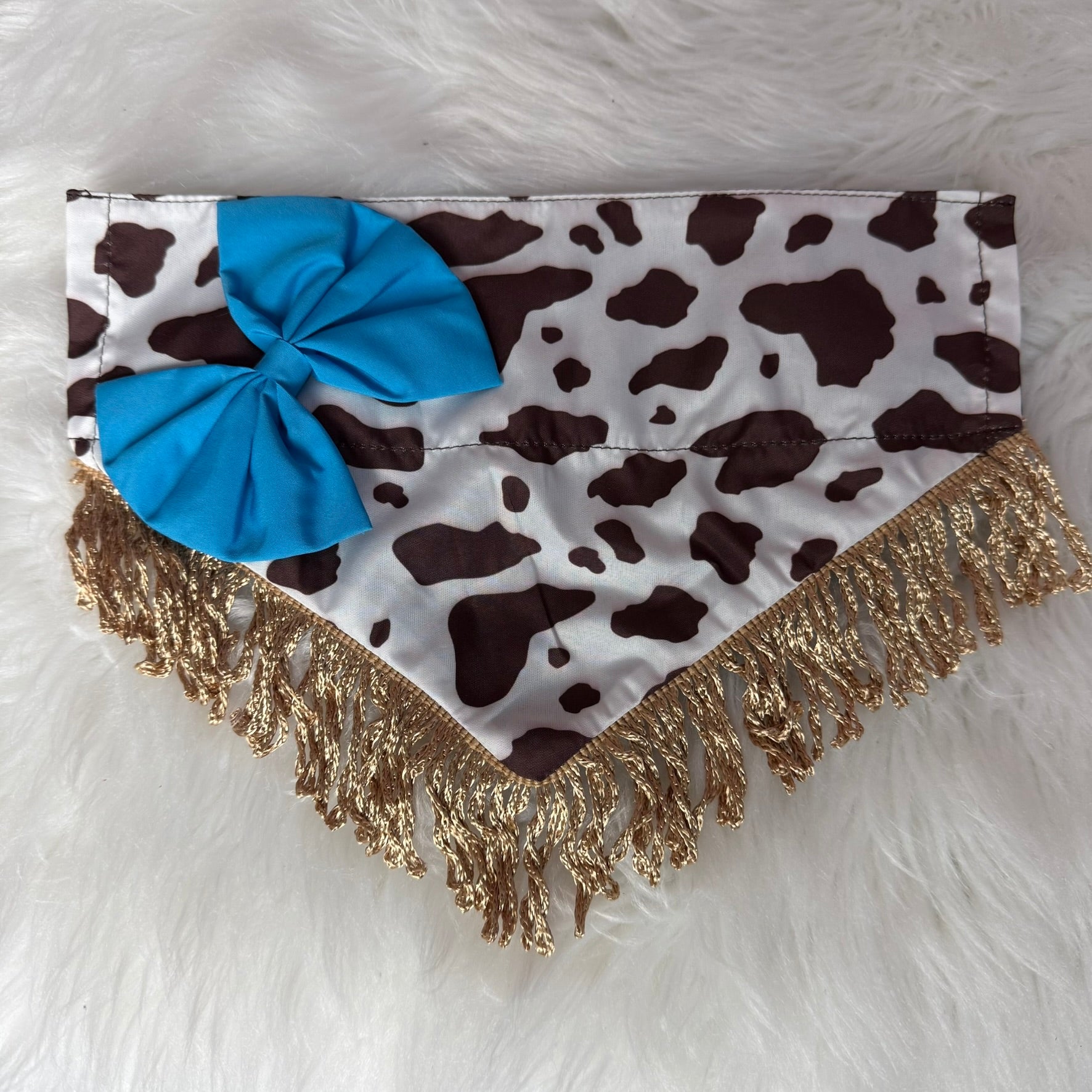 Add a splash of fun to your furry friend's style with this Cow Print Girl OTCBandana 4-pack! Each bandana measures 9.5 x 6 inches with a 2.5-inch collar opening, designed to fit comfortably. Made from fur-resistant fabric, it keeps your pup looking fresh even after playtime. The playful tan tassel fringe around the bottom adds a charming touch, perfect for dog boutique owners and groomers looking to offer something unique and adorable.