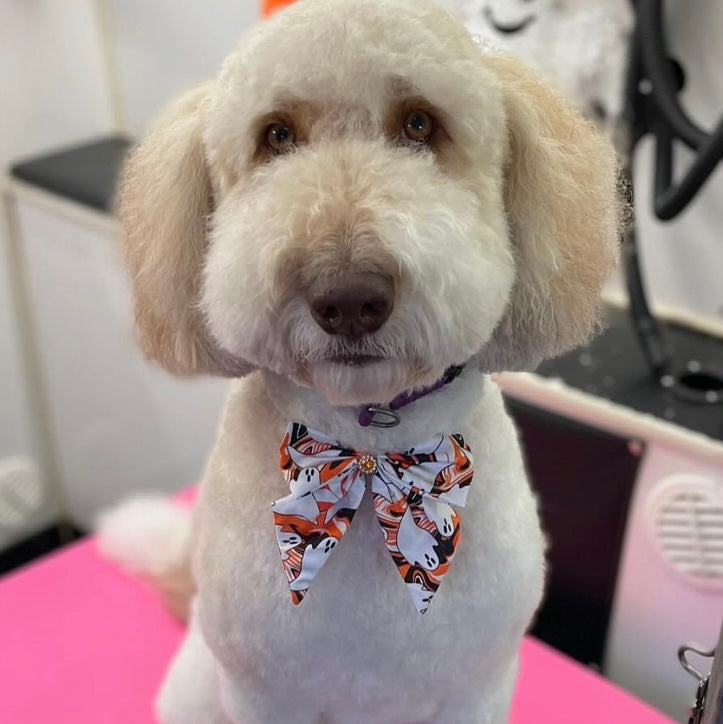 Introduce a spooky flair to your grooming salon with our GHOSTLY SHIRT COLLAR AND BOWTIE . Made with soft ghost print fabric, this Halloween-inspired accessory set is sure to be a hit with your clients. Perfect for adding a touch of fun and whimsy to any grooming session.
