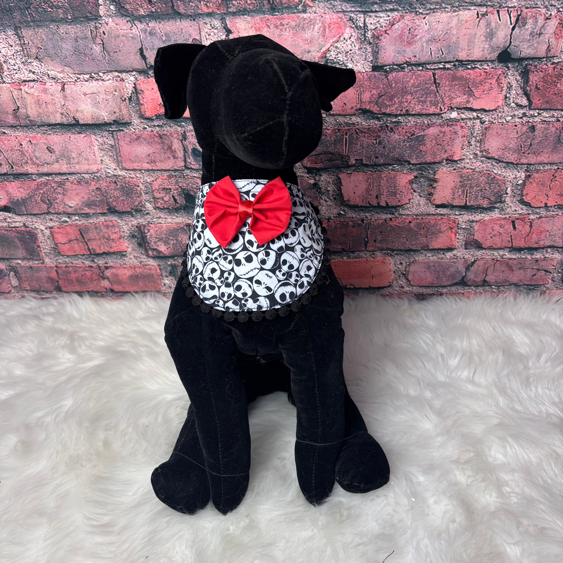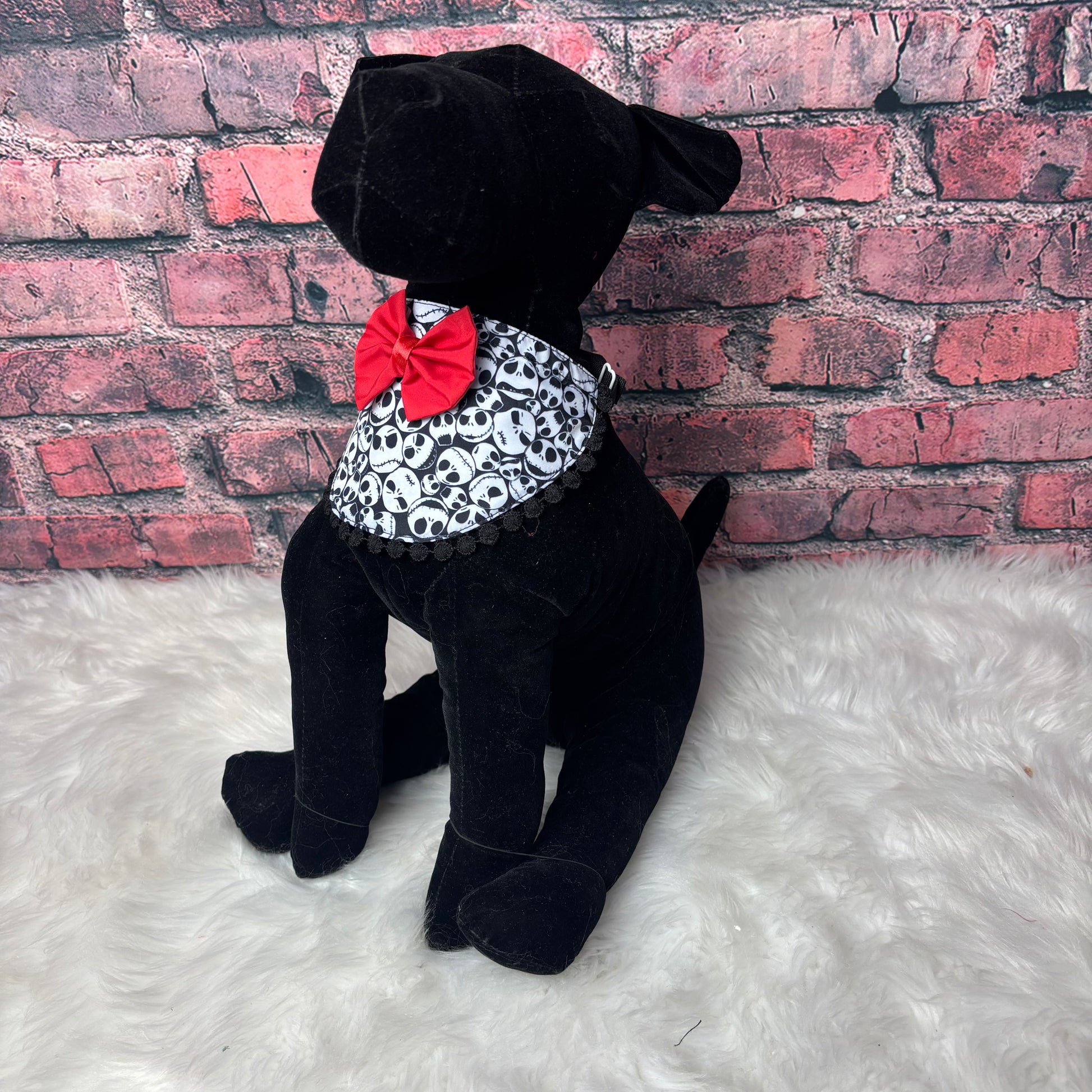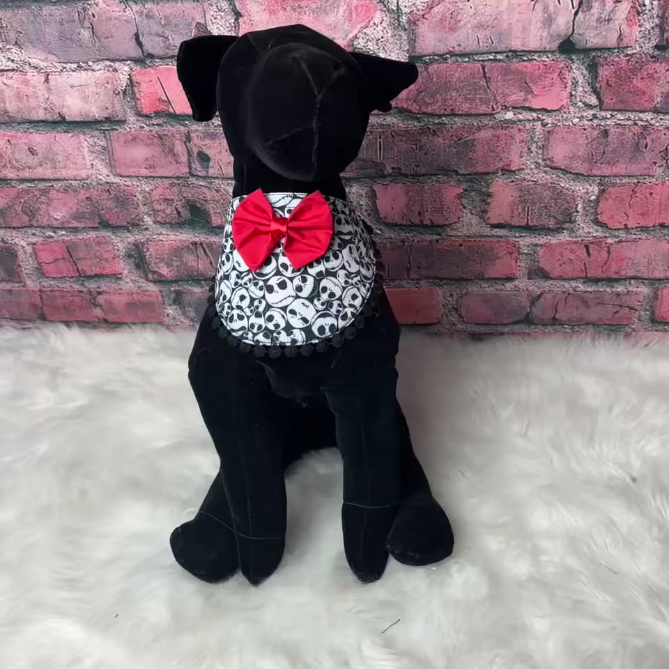Keep your furry friend client stylish with our JACK SKELLINGTON GIRL BIB! Designed for dogs, these bibs are perfect for grooming sessions at the salon. The adjustable band and clasp in the back ensure a comfortable and secure fit. FITS NECK SIZES 9”-13.5”.