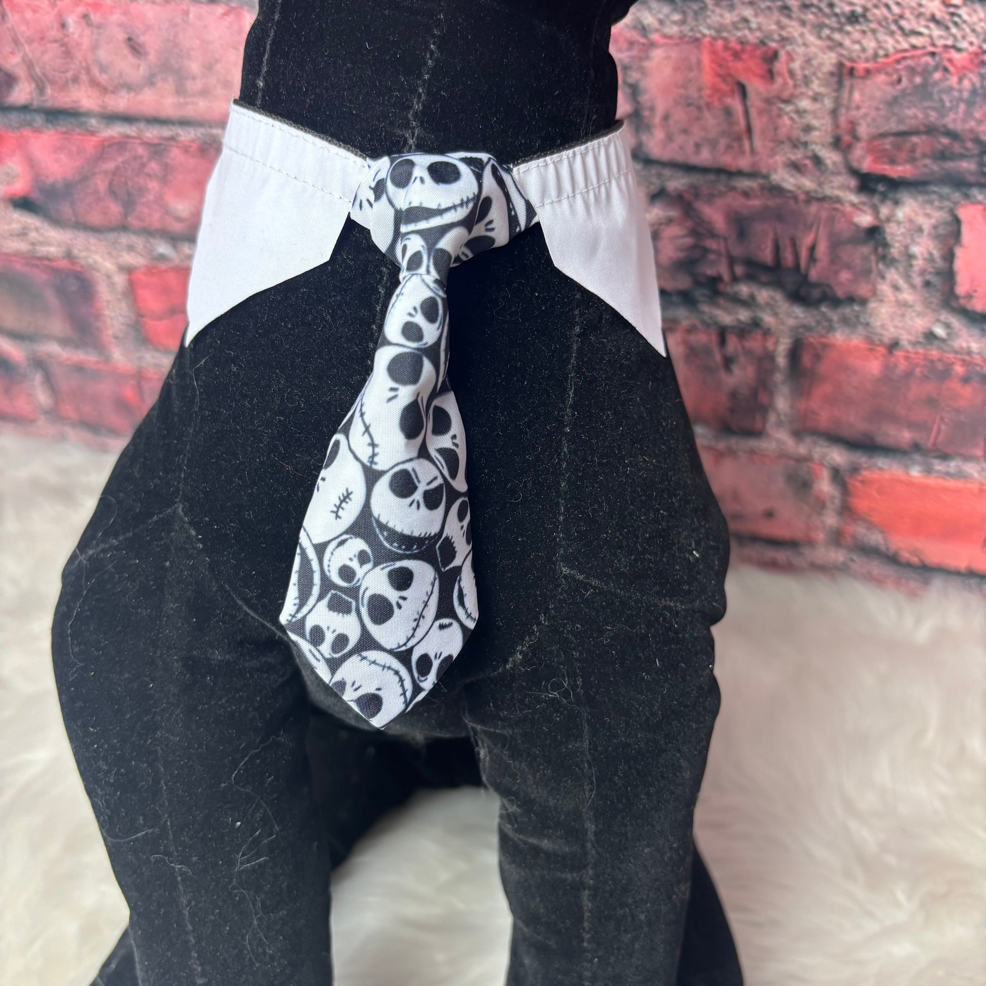 Check out our festive Jack Skellington Shirt Collar & Tie set for small dogs. Elevate your furry client's style with this unique after-grooming accessory. Has adjustable band with clasp for a perfect fit. The perfect addition for your dog grooming salon!