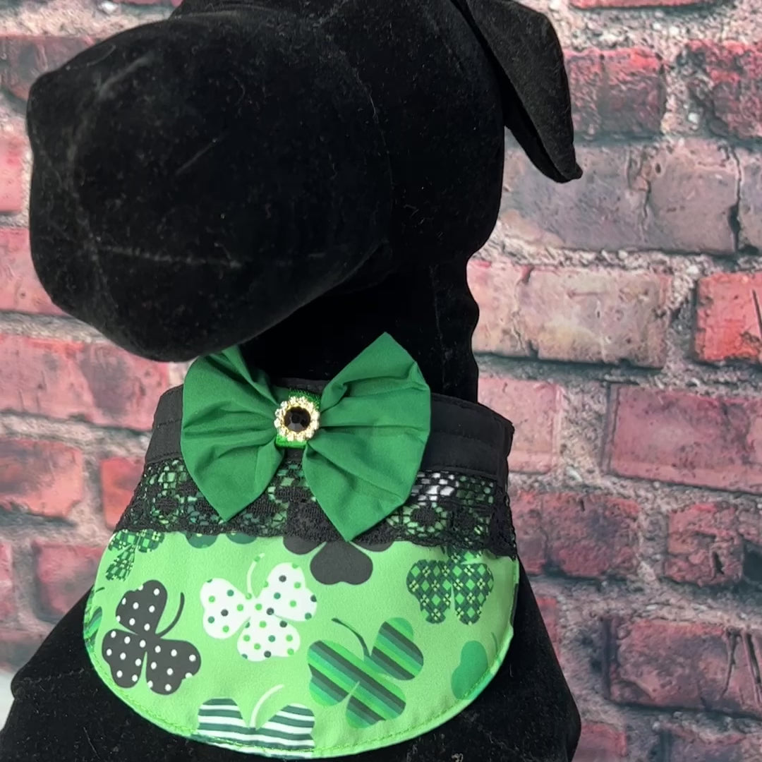 "Get your pup ready for St. Patrick's Day with this Lucky dog girl bib 4 pack! With an adjustable neckband and stylish lace and rhinestone accents, your pup will be the talk of the dog grooming salon. Fits neck sizes 12 to 15 inches. Who's feeling lucky now?"