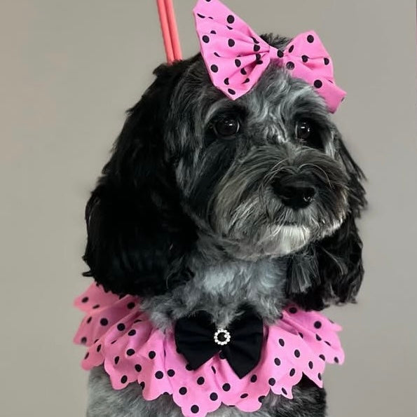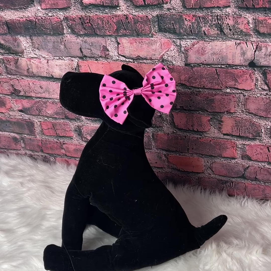 Add some fun and flair to your client's look with our PINK W/ BLACK DOTS OVERSIZED BOW. The playful pink with black dots design will catch everyone's attention and the attached rubber band makes it easy to style. Perfect for your grooming salon, these bows are sure to impress! BOW IS 3”x5”.