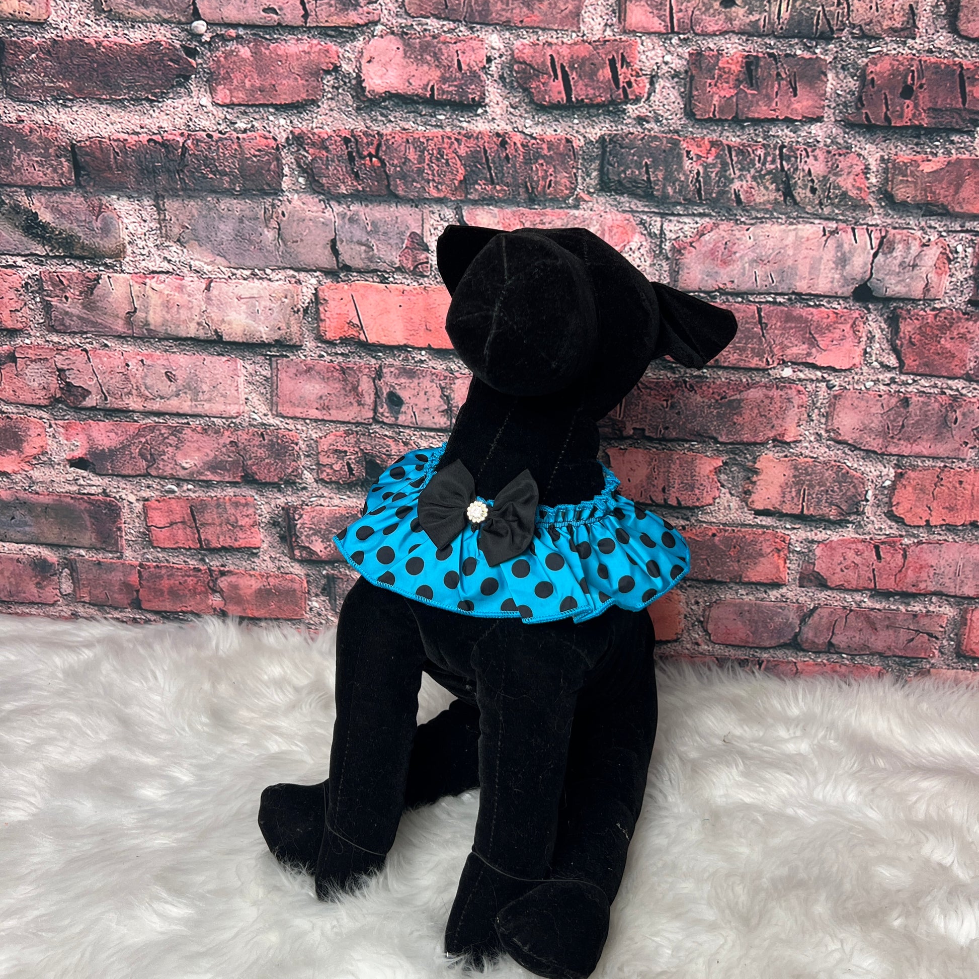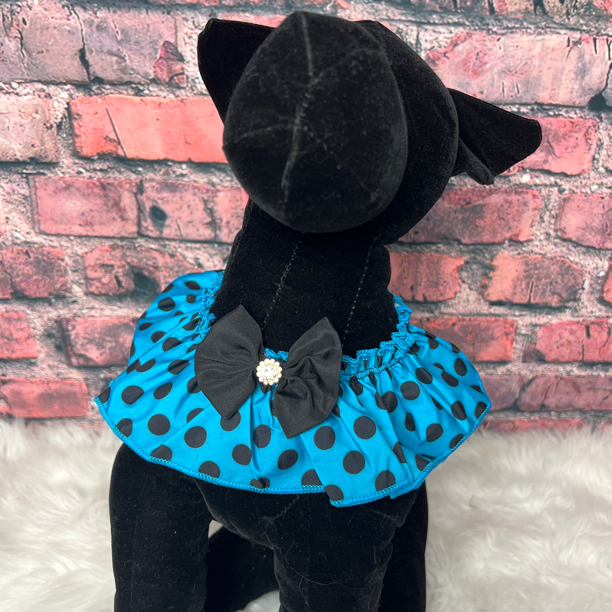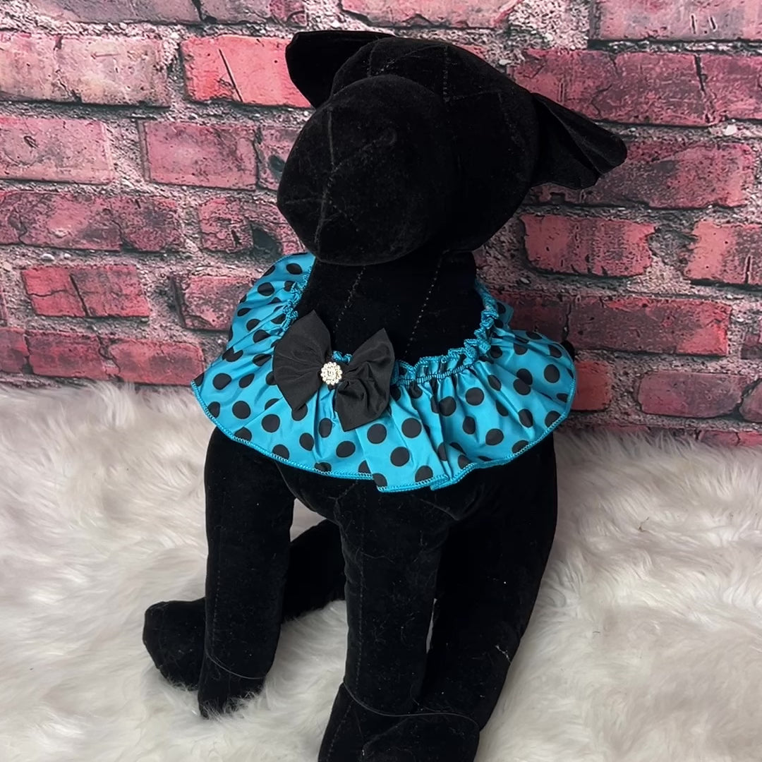 Enhance your grooming salon experience with our TEAL AND BLACK POLADOTS FULL ELASTIC RUFFLE 4 PACK. These stylish accessories are designed with full elastic and ruffle details for a comfortable fit on neck sizes 8-16 inches. Perfect for a polished and professional look.