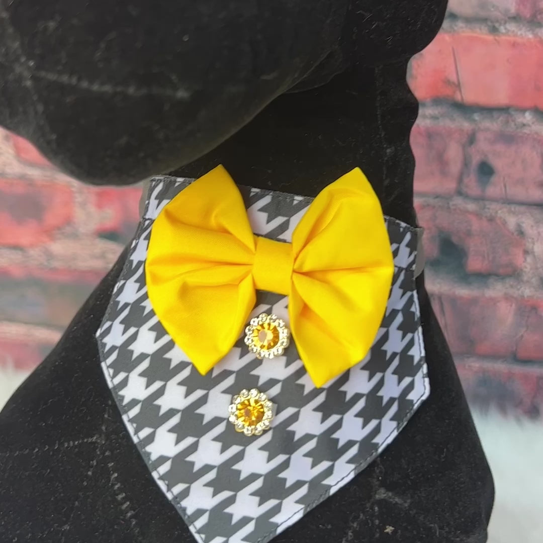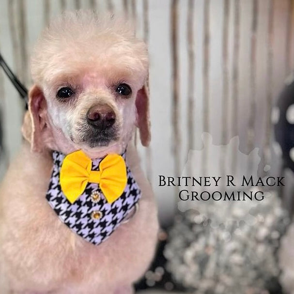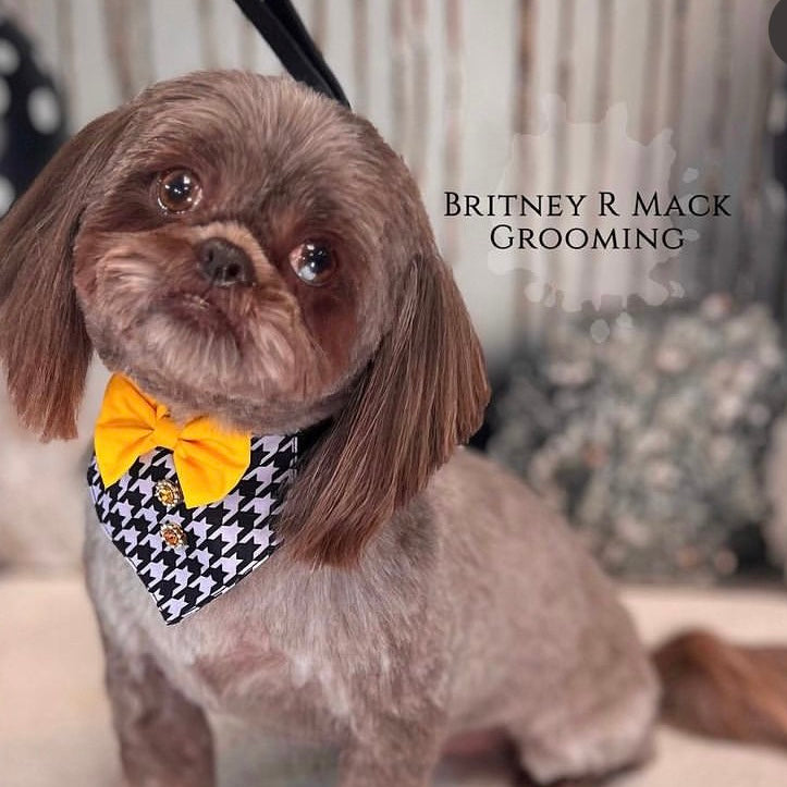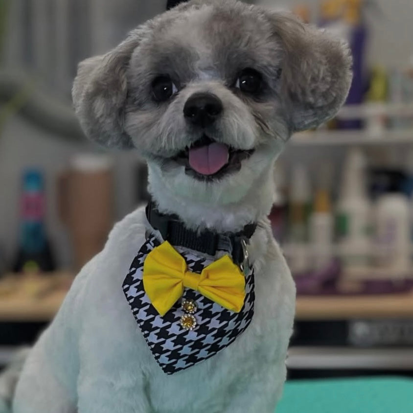 Upgrade your dog grooming experience with our TINY BOY BIB HOUNDSTOOTH 4 PACK. Made from elegant hounds tooth fabric, these bibs are adjustable with an elastic band for a perfect fit for small breeds. Keep your dog looking stylish and clean with ease. Fits 8 to 18 inch neck sizes.