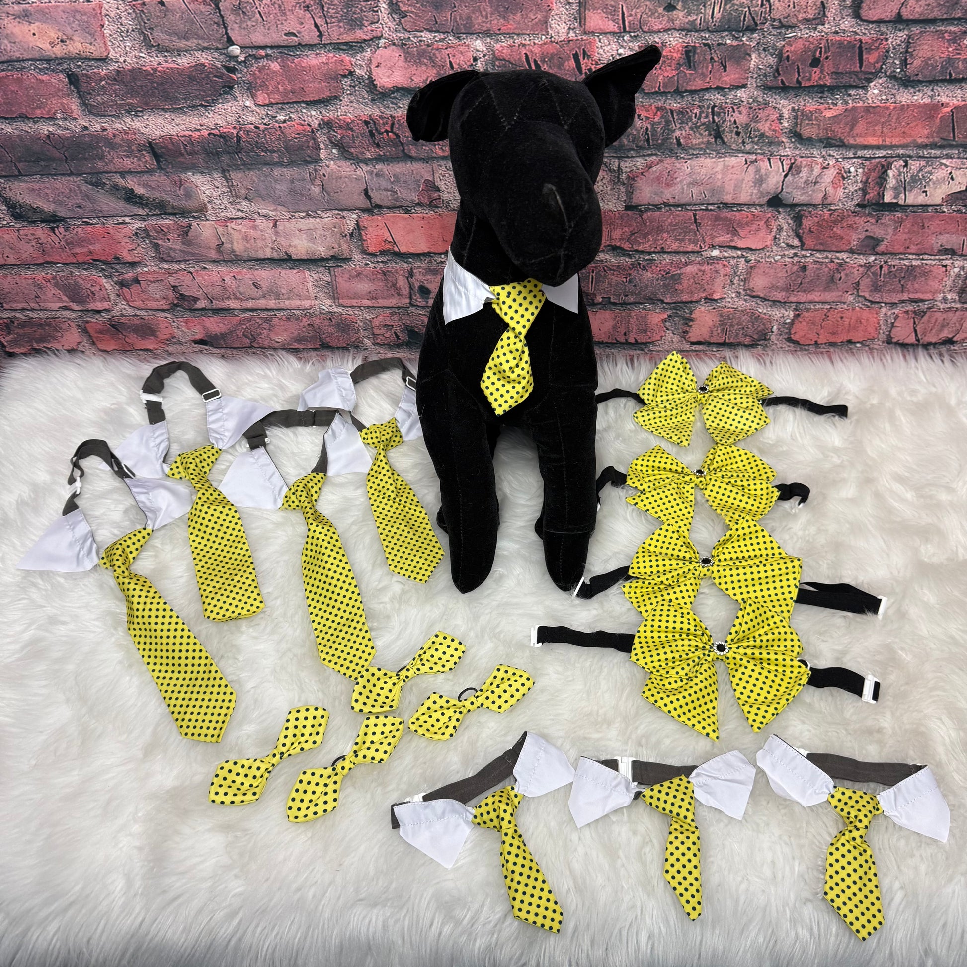 Unleash your pup's style with this Yellow Polka Dot Bundle! Perfect for dog grooming salons, the set includes 4 large ties, 4 small ties, 4 topknot bows, and 4 bow ties with tails. Your furry friend will be the talk of the town with this quirky and fashionable accessory collection.